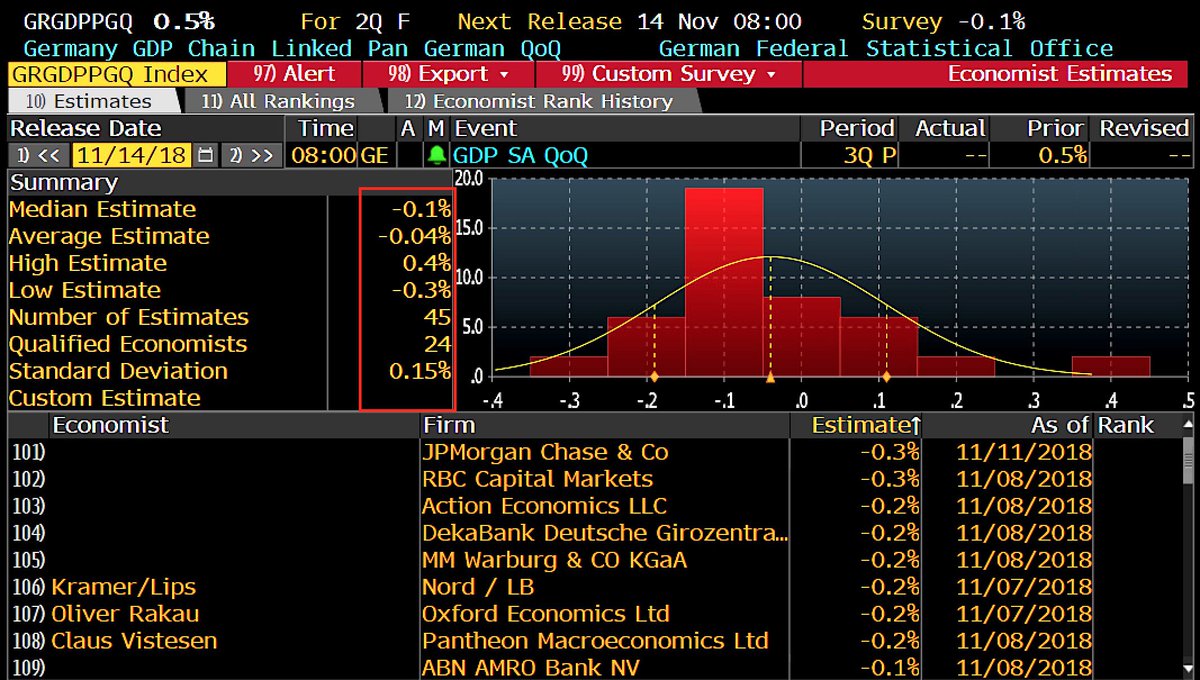While the trade disputes between the US and China loom large for Germany’s export-dependent economy, the developing malaise is broader. The German stock index DAX has dropped 15.4% since the end of January, even after today’s 1.3% gain. “Negative growth” in GDP is now a term that is cropping up to describe the third quarter. The median estimate of analysts surveyed by Bloomberg now shows a decline in GDP of -0.1% from Q2 to Q3. The official first estimate will be released Wednesday.