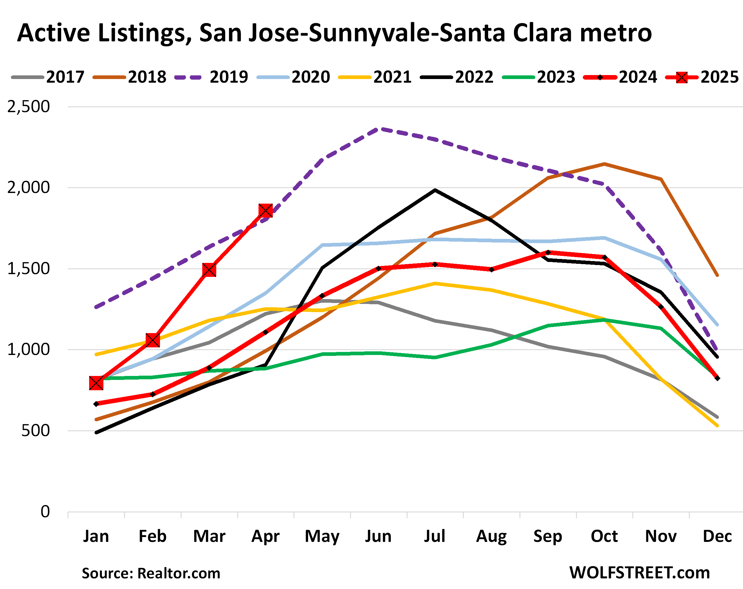 As I explained in the article a COUPLE OF TIMES, active listings in the second half of 2018 and going into 2019 ballooned because of the Fed’s rate-hike cycle pushed mortgage rates to 5% for the first time in 10 years, and sales stalled and inventories ballooned. You can also see that in the charts how listings came up from 2017.