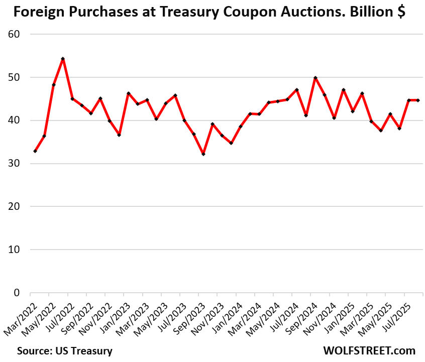I only have the data back to 2022. But so don’t take 2022 as normal. During pandemic mega-QE, the Fed (SOMA) bought huge amounts at auctions, and so that caused the foreign percentage of what was sold to the public (non-SOMA) to shoot up, even though the dollar purchases didn’t change much. See both charts below. If you compare to 2019, today’s percentages look more in line.
