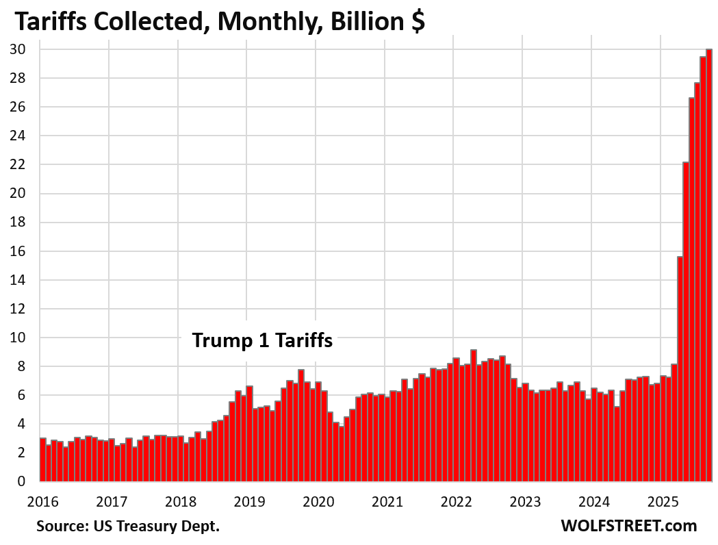 The federal government collected a record $30 billion in tariffs in September. These are net customs duties after refunds. The White House likes to cite “gross” customs duties, which do not include refunds and are a little higher.