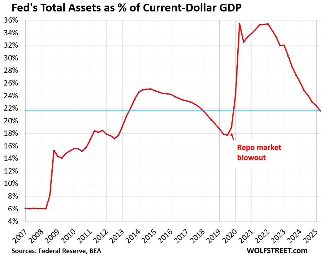 Since the peak of its balance sheet in April 2022, the Fed’s QT has shed $2.38 trillion, or 26.5% of its total assets. In terms of the Pandemic-era QE, the Fed has shed 49.5% of the $4.81 trillion it had piled on from March 2020 through April 2022.