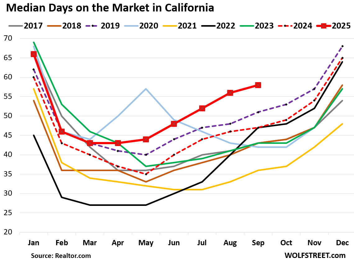 In California, the median number of days that a home spent on the market jumped to 58 days in September, by far the highest for any September over the past decade, 7 days longer than in 2019, and 15 days longer than in 2017 and 2018: