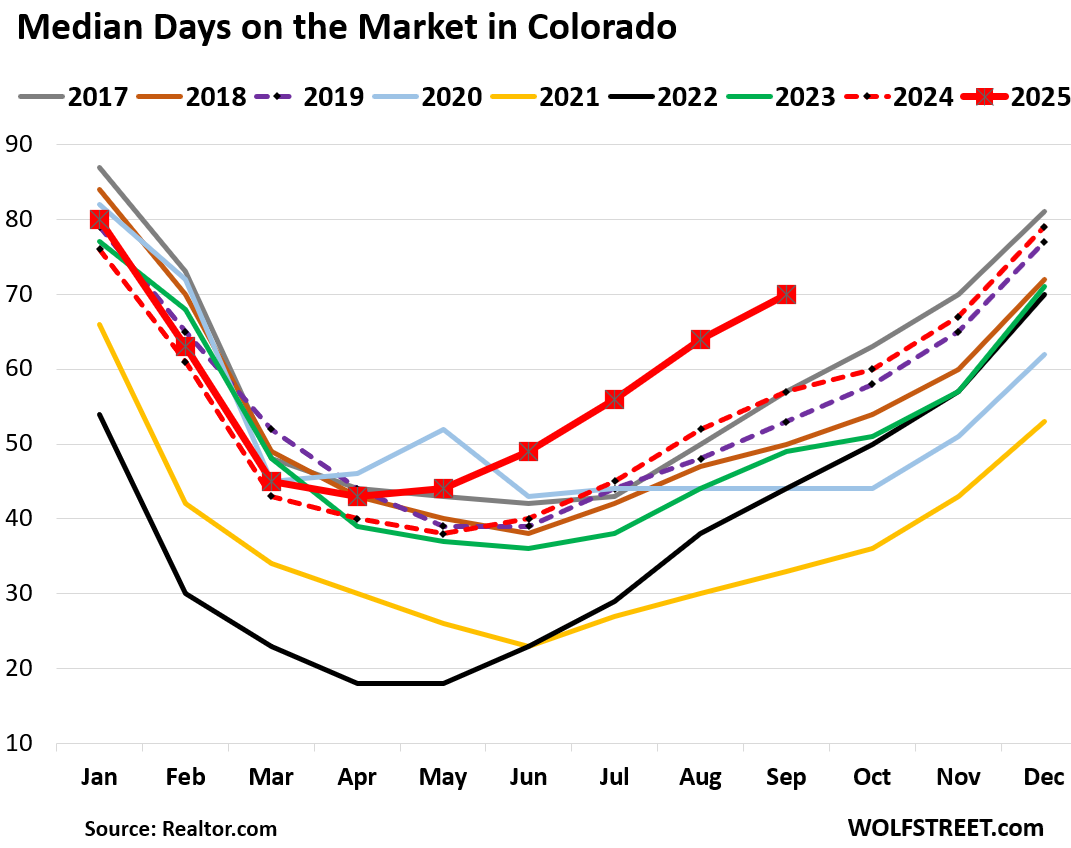 In Colorado, homes lingered 70 days on the market before selling or getting pulled, 17 days longer than in 2019, 20 days longer than in 2018, and 13 days longer than in 2017.