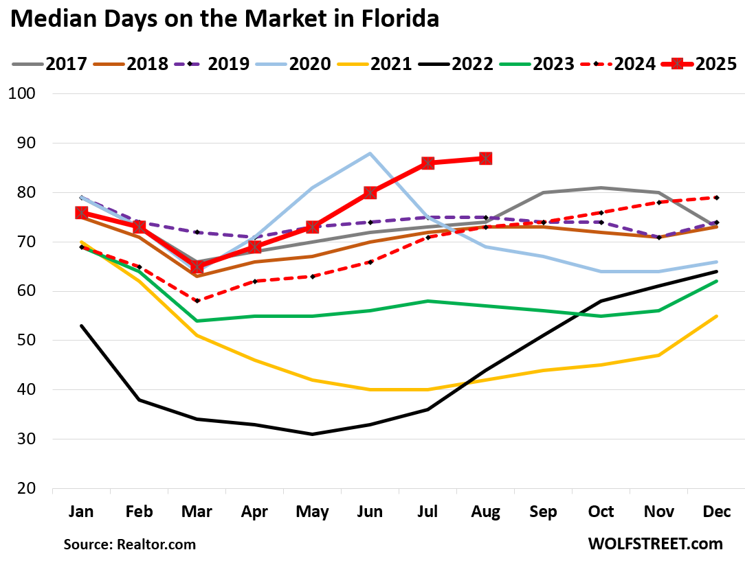 In Florida, the median number of days that a home sat on the market before it was sold or delisted jumped to 87 days, by far the longest for any September in at least a decade, and the second longest in that decade overall, behind only June 2020.