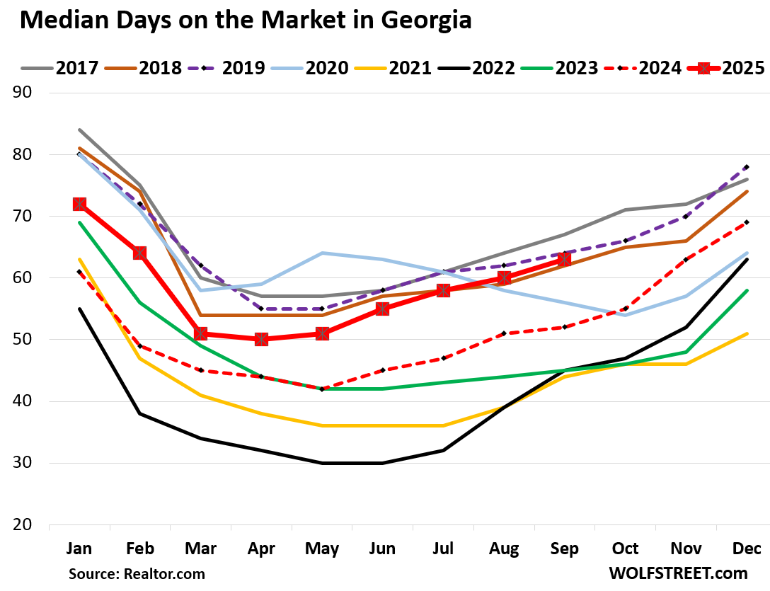 But in Georgia, median days on the market, which rose to 63 days, the third-longest for any September over the past 10 years, was still below the Septembers in 2019 (64 days) and in 2017 (67 days):