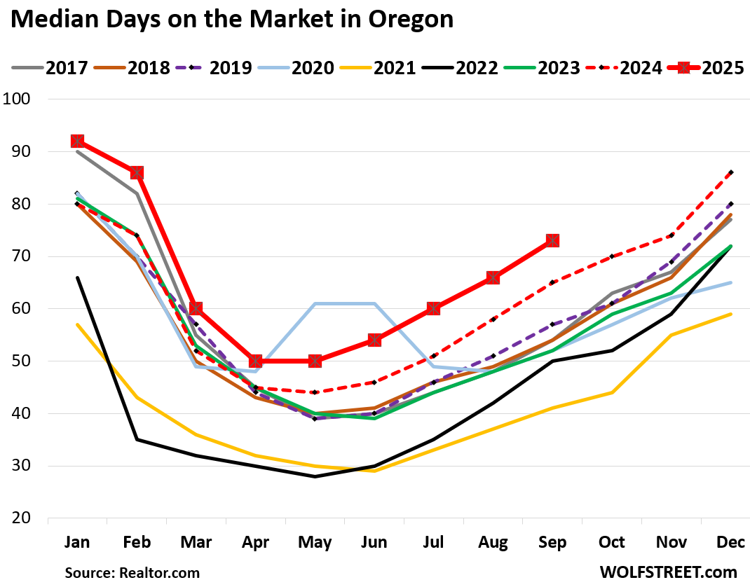 In Oregon, homes sat 73 days on the market in September before selling or getting pulled, 16 days longer than in 2019, and 19 days longer than in 2018 and 2017.