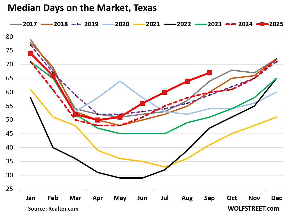 In Texas, the median number of days a home spent on the market jumped to 67 days, by far the longest for any September in at least a decade, 8 days longer than in 2019, 7 days longer than in 2018, and 3 days longer than in 2017: