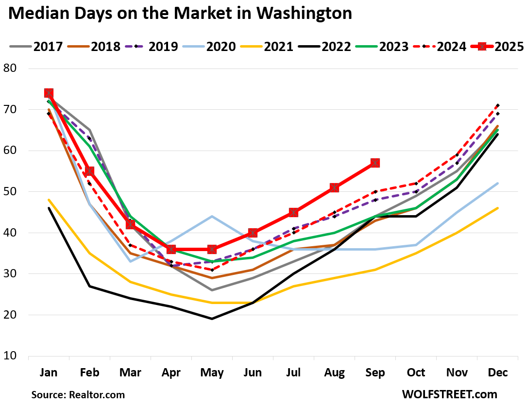 In Washington, homes sat 57 days before selling or getting pulled, by far the highest for any September since at least 2016 – which is as far as the data from Realtor.com goes back. This was 9 days longer than in 2019, 14 days longer than in 2018 and 13 days longer than in 2917
