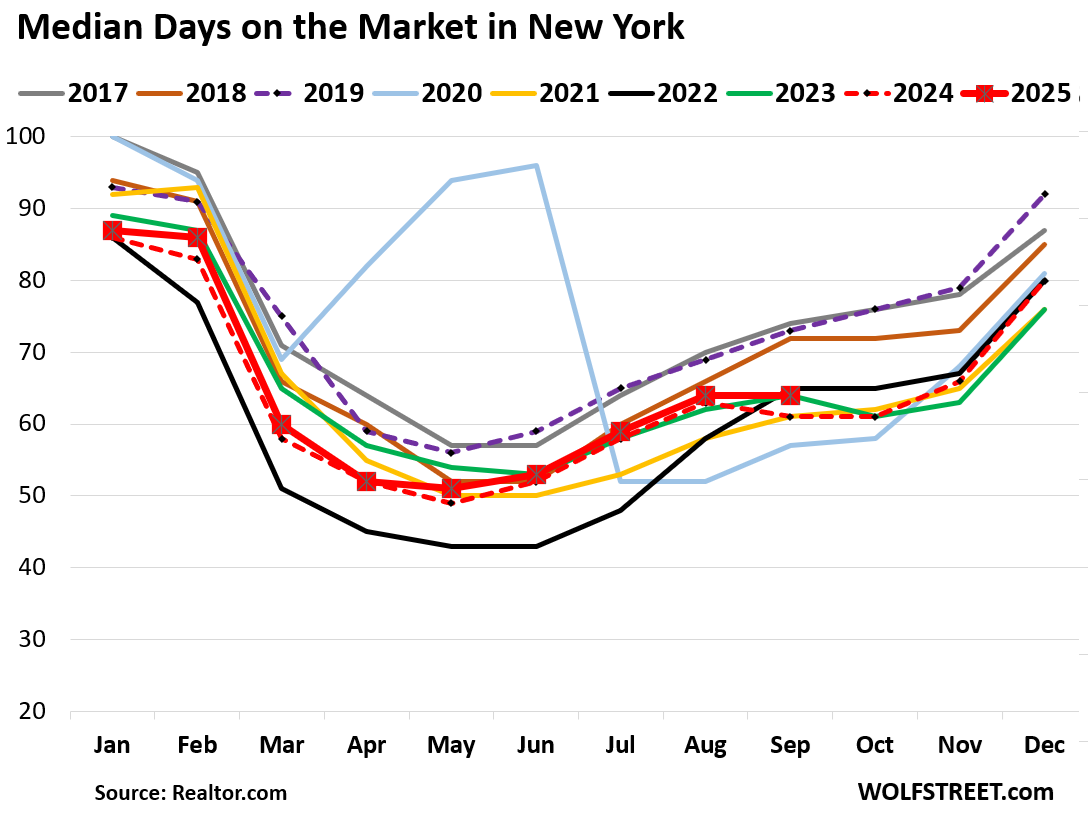 It was 12 days longer than in 2019, 14 days longer than in 2018, and 13 days longer than in 2017, according to data from Realtor.com, which goes back only to 2016 (dotted red line = 2024; dotted purple line = 2019):