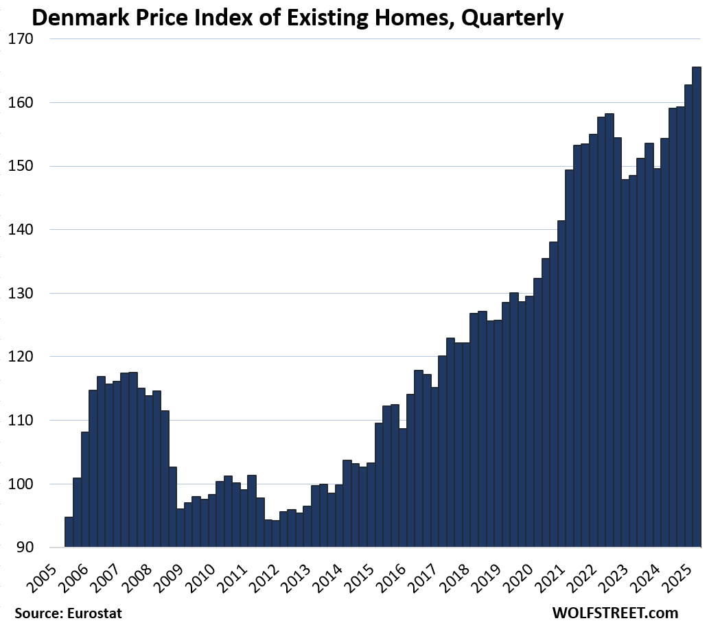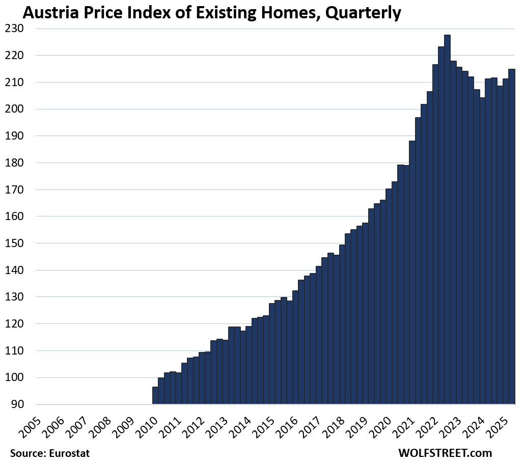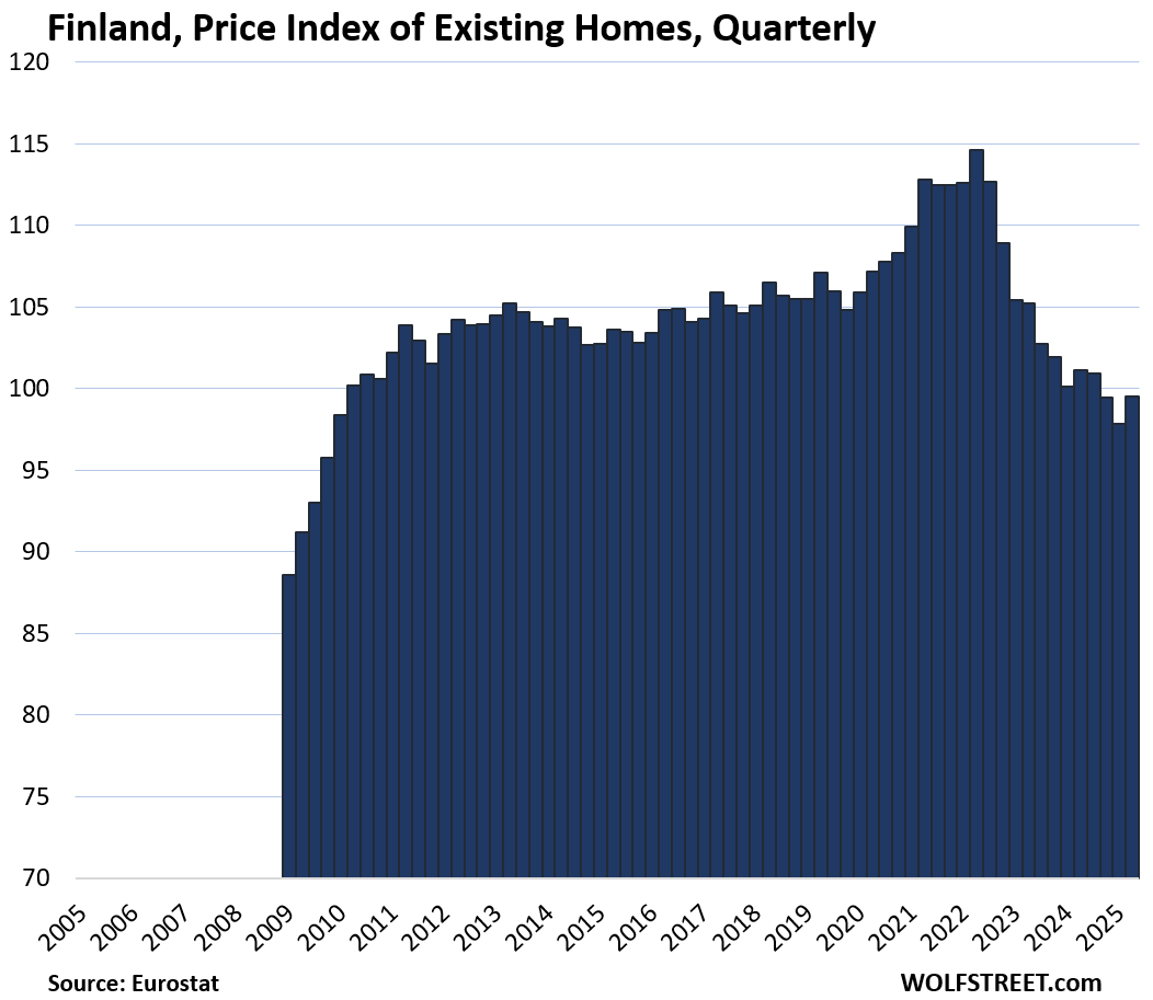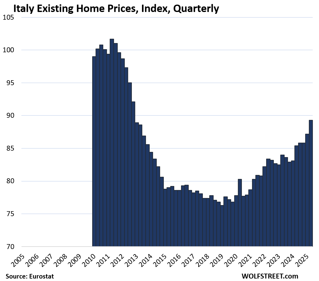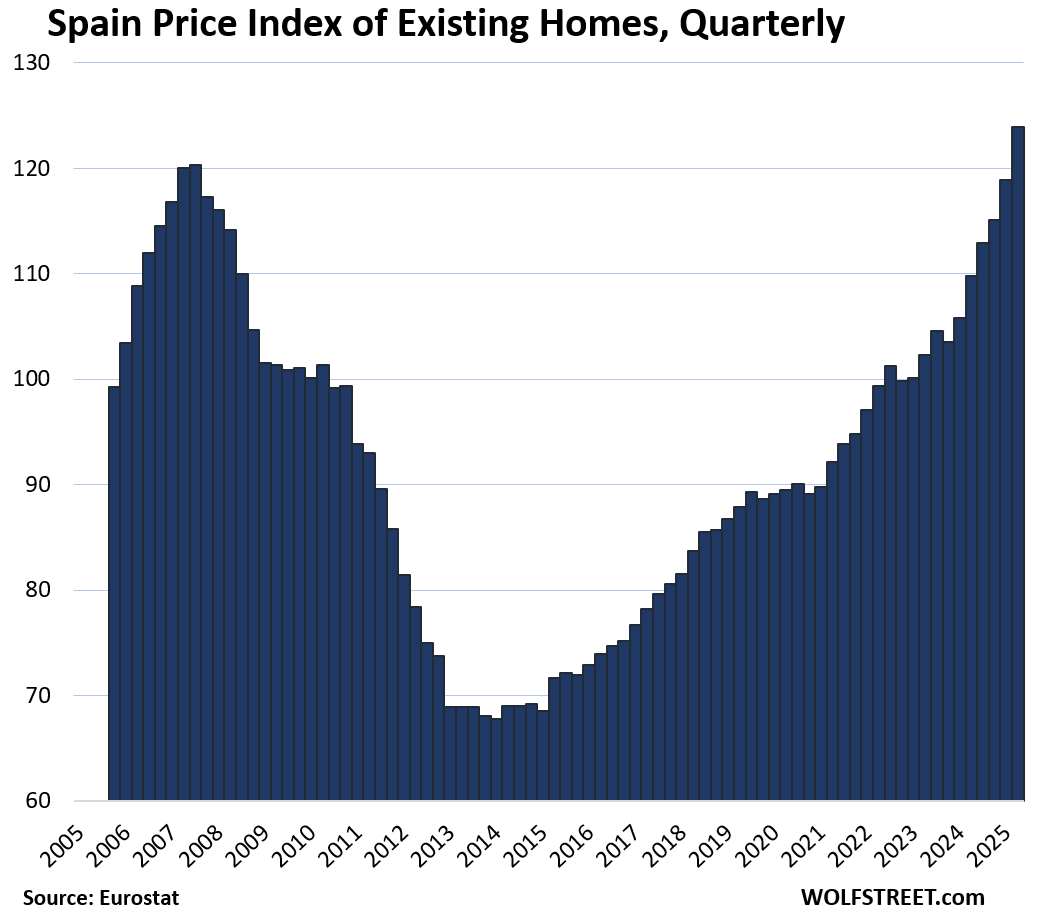 In one (Finland), home prices have fallen back where they’d been in 2010. In another (Italy), prices are still well below 2010 though they’re surging now. And in another (Spain), prices just now rose above the prior bubble peak 18 years ago, whose dramatic implosion had shaking the country.