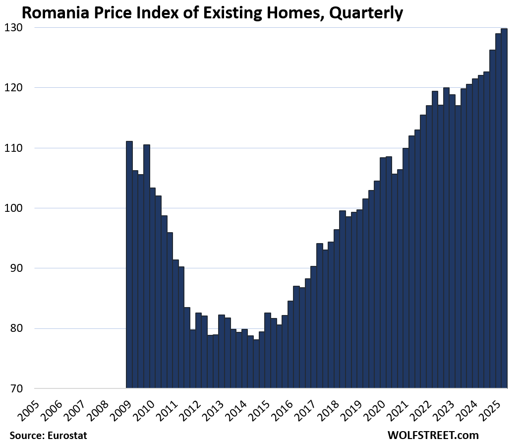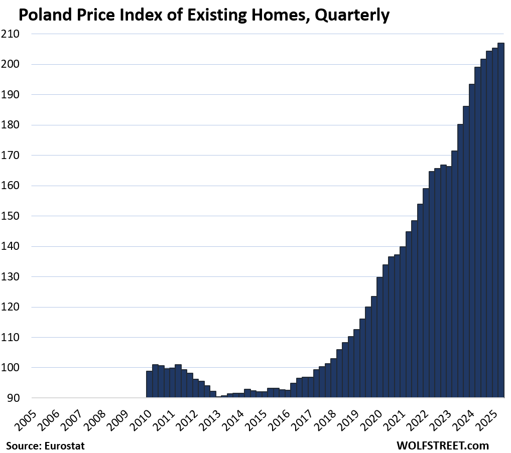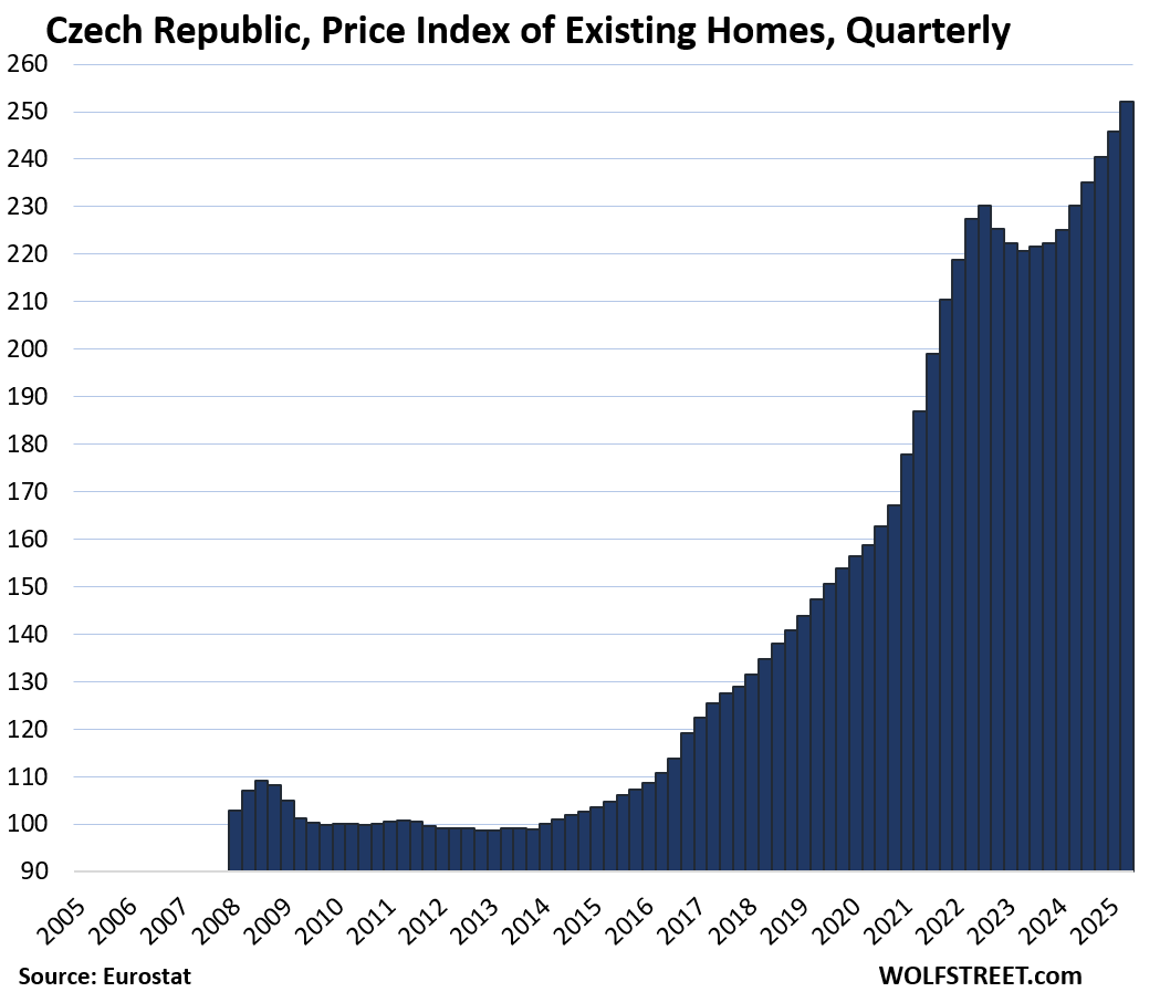 Prices of existing homes of all types (“dwellings”) in the 16 largest countries in the European Union (EU) or in the European Economic Area (EEA) by GDP have varied substantially. Some of these countries have splendid housing bubbles. While prices of a few of them have deflated some, in others, prices continued to explode, such as in the Czech Republic, were prices have spiked by 155% in 11 years.