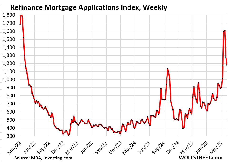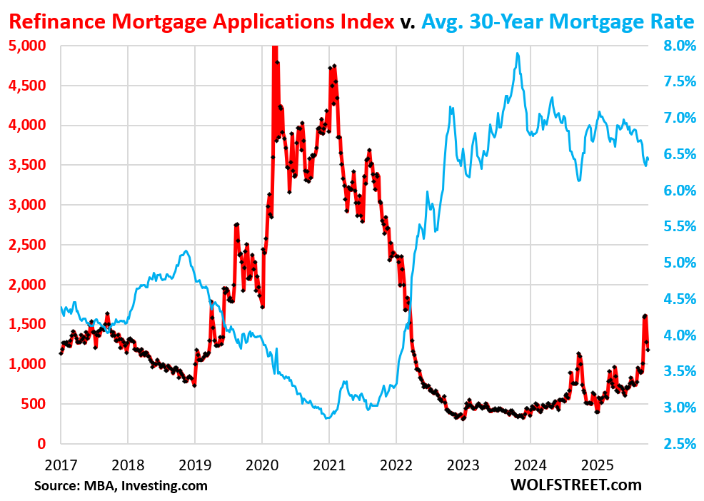The prior spike in demand for refi mortgages occurred a year ago in September 2024, when the MBA’s measure of the average weekly 30-year fixed mortgage rate dropped as low as 6.13%.