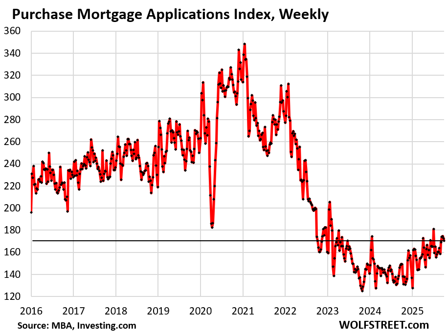 The average weekly mortgage rate for conforming 30-year fixed mortgages edged down to 6.43%, according to the Mortgage Bankers Association today. But that was still higher than two weeks ago and three weeks ago, and quite a bit higher than in September and early October 2024 when it bottomed out at 6.13% just before the Fed started cutting interest rates.