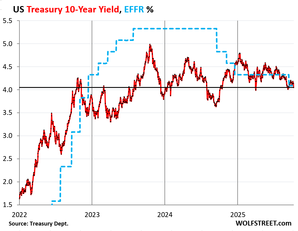 These bond investors bet that inflation will cool further over the longer horizon, and that the relatively low yields they get on their securities will therefore adequately remunerate them for inflation and for the risks they’re taking, and that the cooling of inflation will cause yields to decline further in the future, thereby pushing up prices of bonds that had been issued earlier at higher yields.