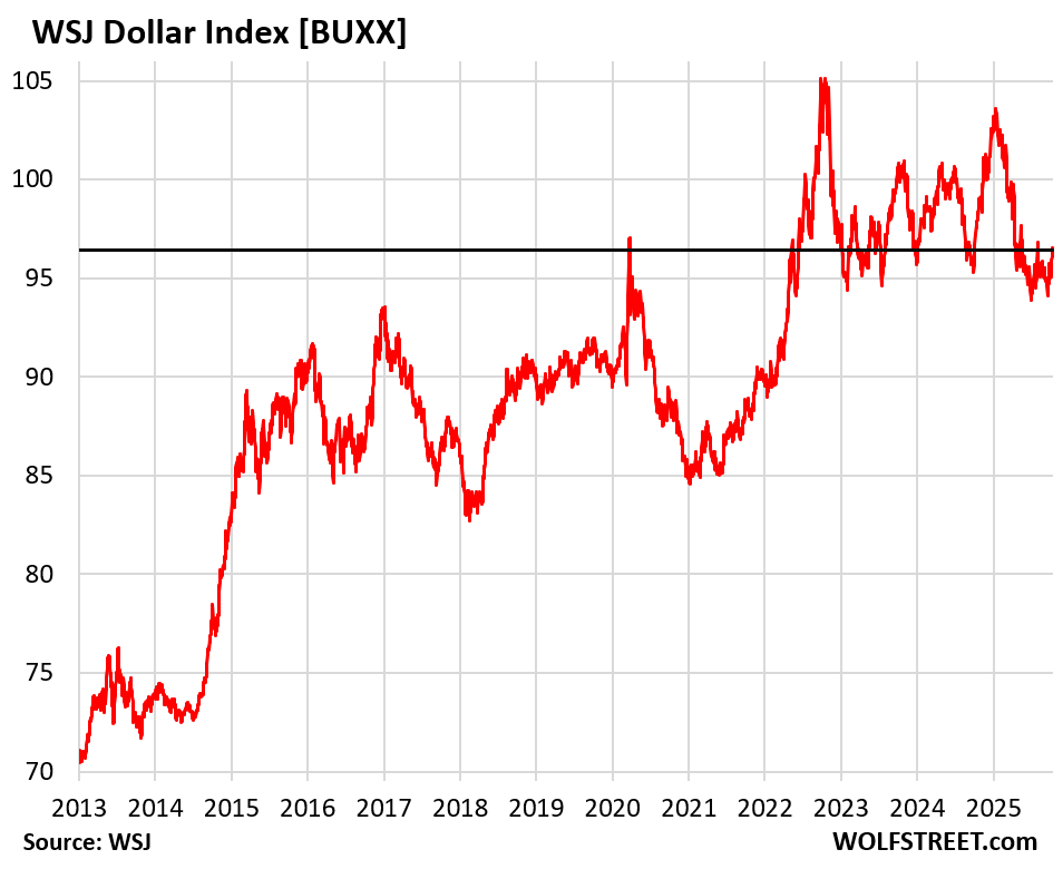 What did occur is that the dollar indices had spiked in the last four months of 2024 and topped out at the very end of December. And that four-month spike was then unwound-plus-some over the six months exactly from the beginning of January through the beginning of July, with the euro and yen dominated DXY Dollar Index dropping 11% and the broader WSJ Dollar Index [BUXX] dropping 9% over the first six months of the year.