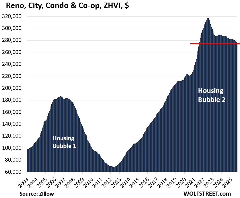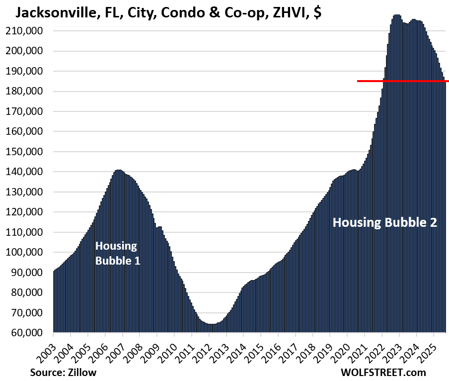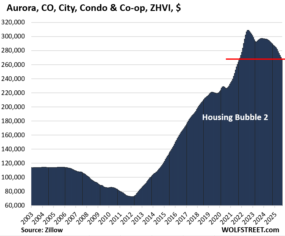 Methodology and data: These prices here are seasonally adjusted three-month averages of “mid-tier” condos and co-ops in “cities” (not in Metropolitan Statistical Areas) from the Zillow Home Value Index (ZHVI), which is based on millions of data points in Zillow’s “Database of All Homes,” including from public records (tax data), MLS, brokerages, local Realtor Associations, real-estate agents, and households across the US. It includes pricing data for off-market deals and for-sale-by-owner deals. These are not median prices.