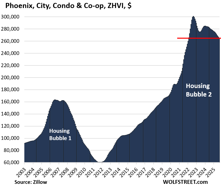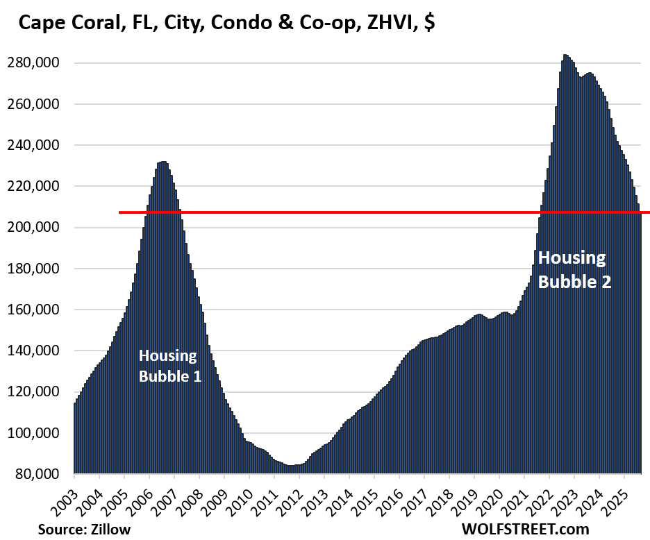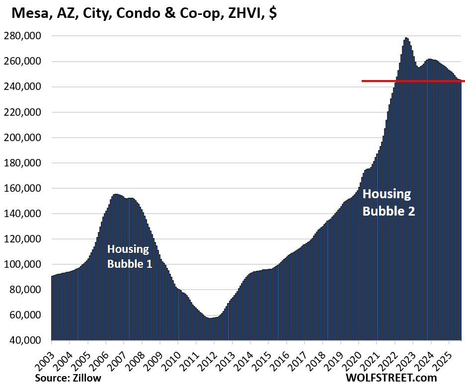 Back to where prices had first been in 2005, 20 years ago, below the peak of Housing Bubble 1. Boom-Bust, Boom-Bust.