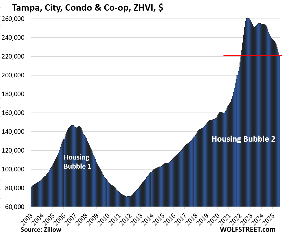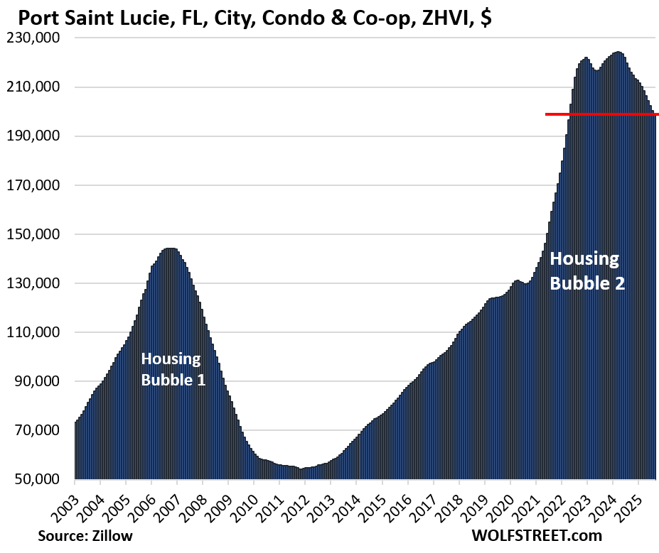 Condo prices in many of these cities, after running up for years, exploded from early 2020 through mid-2022 by 50%, 60%, 70% or more, in just two-and-a-half years, amidst an astounding FOMO-driven buying behavior and general investor-mania during the Free-Money era which created what was perhaps the most extraordinary condo bubble ever.