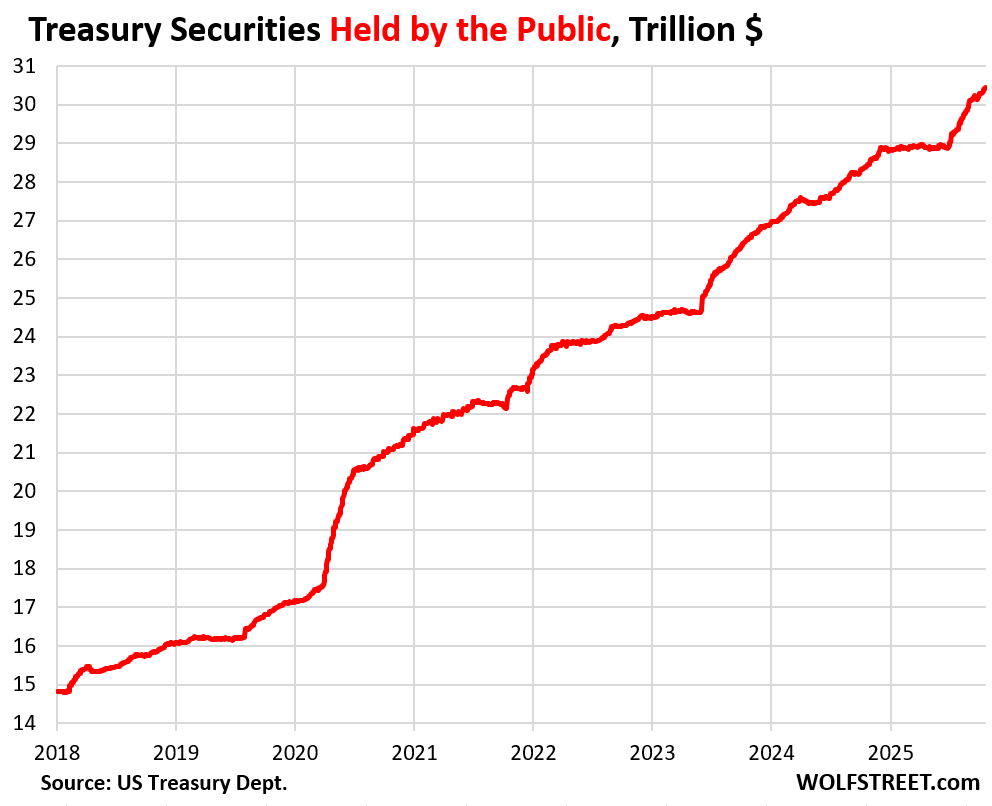 Of that $38.01 trillion in Treasury securities, $30.44 trillion are “held by the public” – they’re the publicly traded Treasury securities held in accounts in the US and around the world, in brokerage accounts, by banks, by insurance companies, at financial centers, by central banks, by the Fed, etc.