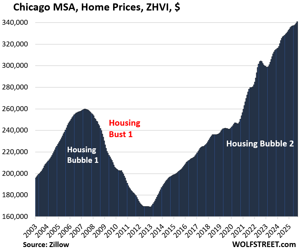 The huge Chicago-Naperville-Elgin, IL-IN metro, where prices of single-family homes and condos increased by 3.5% year-over-year to a new record – the largest YoY increase of the 33 biggest and expensive metros we track here – forms the opposite end of the spectrum from the Austin metro (-23% from peak) and the San Francisco metro (-11% from peak). Every market dances to its own drummer: