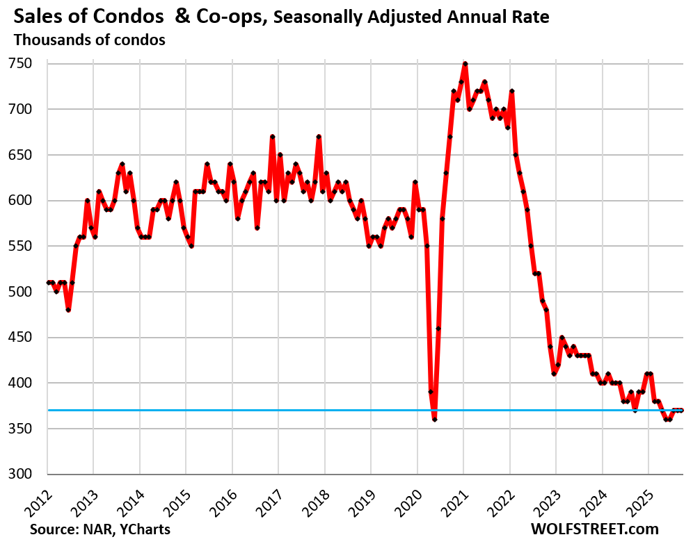 Sales of condos and co-ops that closed in September were unchanged from the prior month for the third month in a row, at a seasonally adjusted annual rate of 370,000 condos, barely up from the record lows in NAR’s condo data going back to 2011.