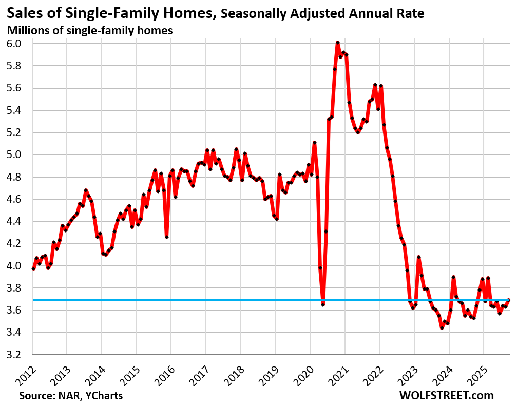 September marks the third year in a row that sales of existing single-family homes have wobbled along totally crushed levels (historical data from YCharts):