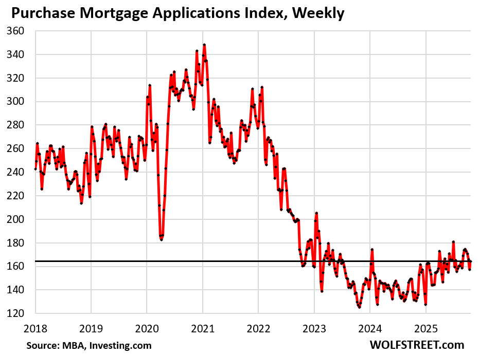 Compared to the same week in 2019, purchase mortgage applications were down by 34%, the new normal – despite the much lower mortgage rates. The immensely hyped theme that lower mortgage rates would unleash waves of demand just hasn’t panned out.