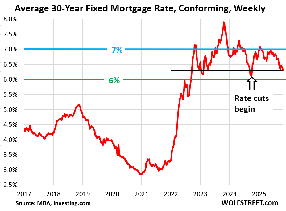 But the average mortgage rate for conforming 30-year fixed mortgages declined by 7 basis points to 6.30% in the latest week, the lowest level in a year, according to the Mortgage Bankers Association today.