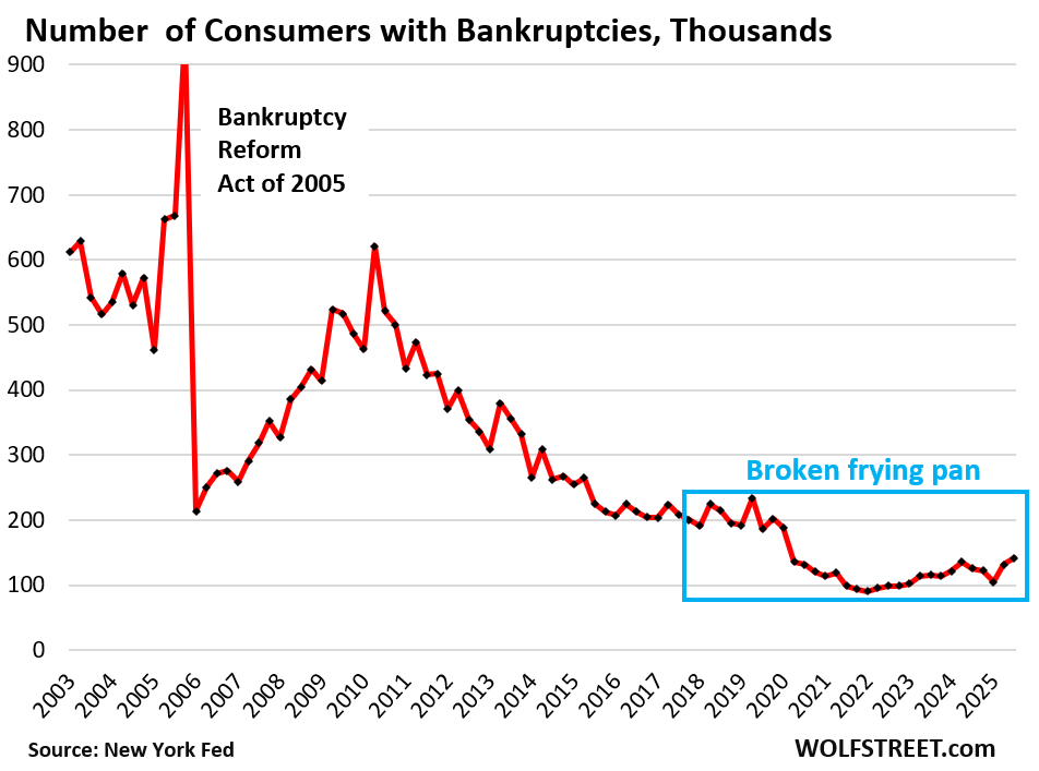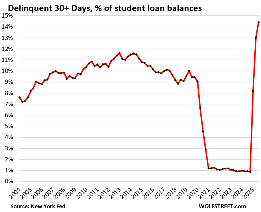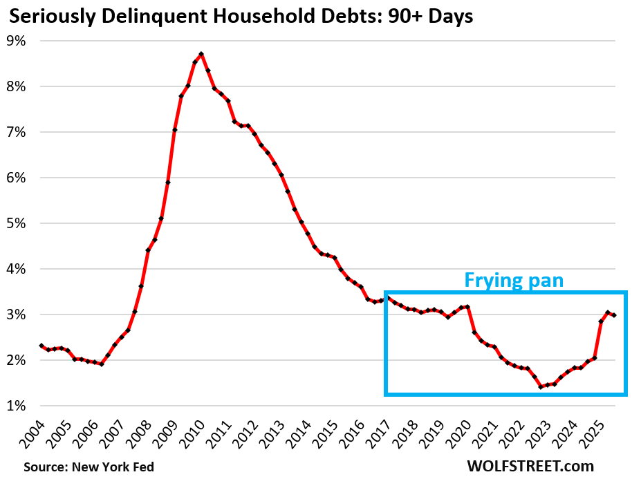 And student loan borrowers… In 2025, federal student loans that had been covered by the government’s forbearance policies since 2020 came out of forbearance, and those loans that had defaulted but hadn’t counted as defaulted suddenly started showing up on credit reports again, and delinquency rates exploded.