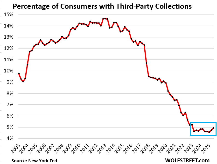 The percentage of consumers with third-party collections had plunged from over 14% in 2013 to 4.6% in early 2023 and has hobbled along near those record lows even after the free money vanished. In Q3, it was 5.0%.