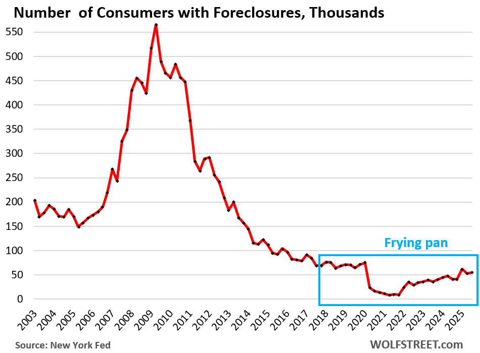 Foreclosures are low. The number of consumers with foreclosures in Q3 inched up to 54,760, well below the low end of the 65,000-to-90,000 range of the Good Times in 2018-2019, and was far below the number of foreclosures in prior years.