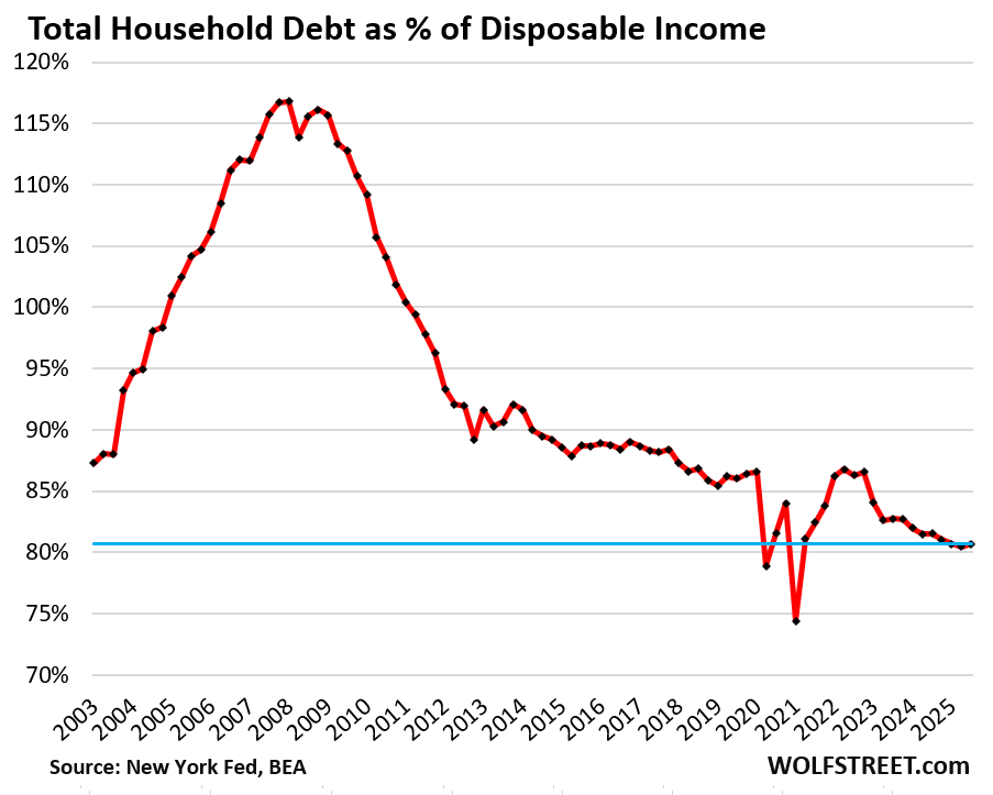 The debt-to-disposable income ratio in Q3 was 80.7%, a hair higher than Q2, which had been the lowest in the data going back to 2003, except for two freak quarters during the stimulus era (Q1 2021 and Q2 2020).