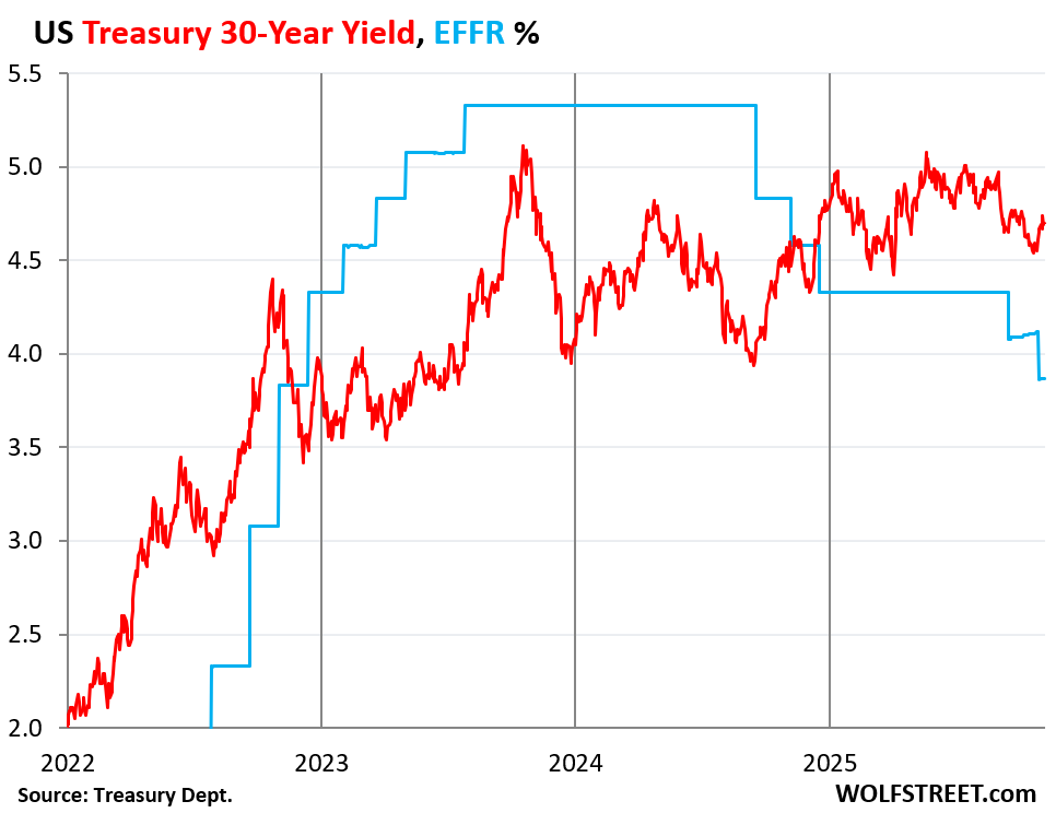 The 30-year Treasury yield rose to 4.70%. It was 4.55% just before the October rate cut, and 3.94% before the rate cut in September 2024.