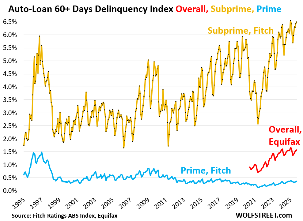 For prime-rated auto loans, the 60-plus day delinquency rate ticked up to 0.37% at the end of September, according to Fitch, which rates asset-backed securities (ABS) backed by auto loans. The recent high was 0.39% in January and February. Even during the Great Recession, the prime delinquency rate maxed out at only 0.9% (blue in the chart).