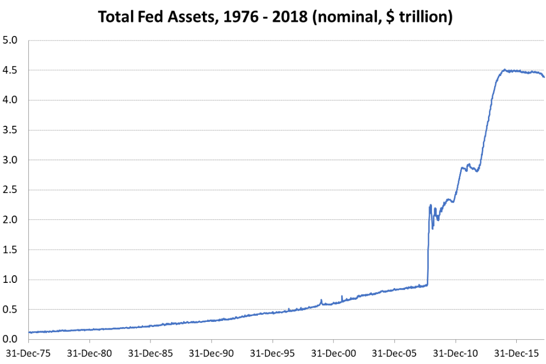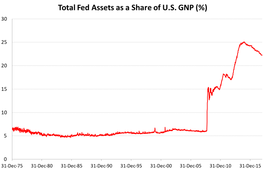 Chart #1 (blue line) shows total assets in dollars 1975-2015. You see how they steadily increased from 1975 to 2008, and then ballooned.