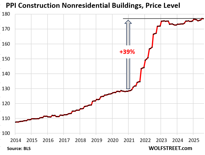 Construction cost inflation for nonresidential buildings rose only by 1.0% over the nearly three years since the beginning of 2023, after having flattened out from the 37% spike in 2021 and 2022, according to the Producer Price Index for Construction of Nonresidential Buildings through August.