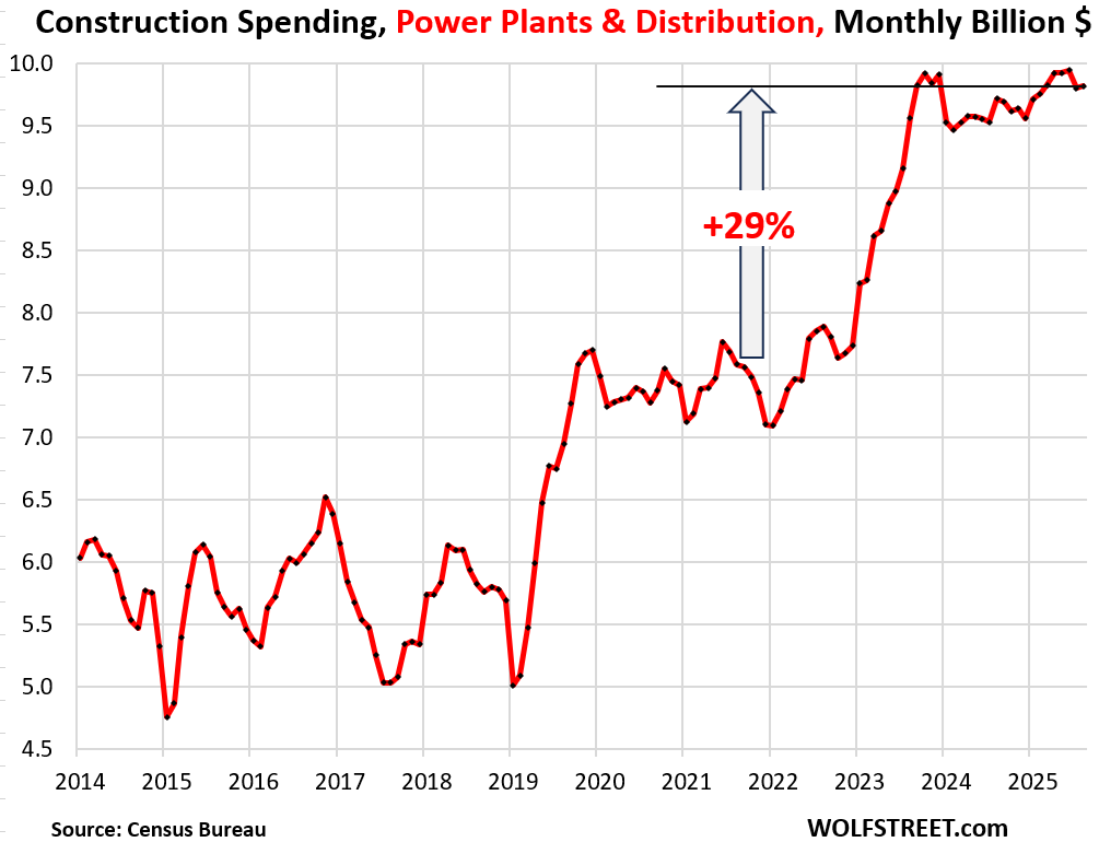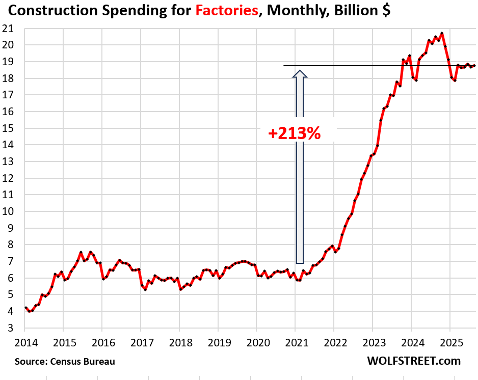 Construction of factories, though still at a red-hot pace, has slowed from the spike in 2024, possibly as construction resources have been pulled away by the mindboggling boom in data center construction, and amid reports of bottlenecks, shortages of skilled labor, and ICE hauling off workers from construction sites, such as from the Hyundai factory.