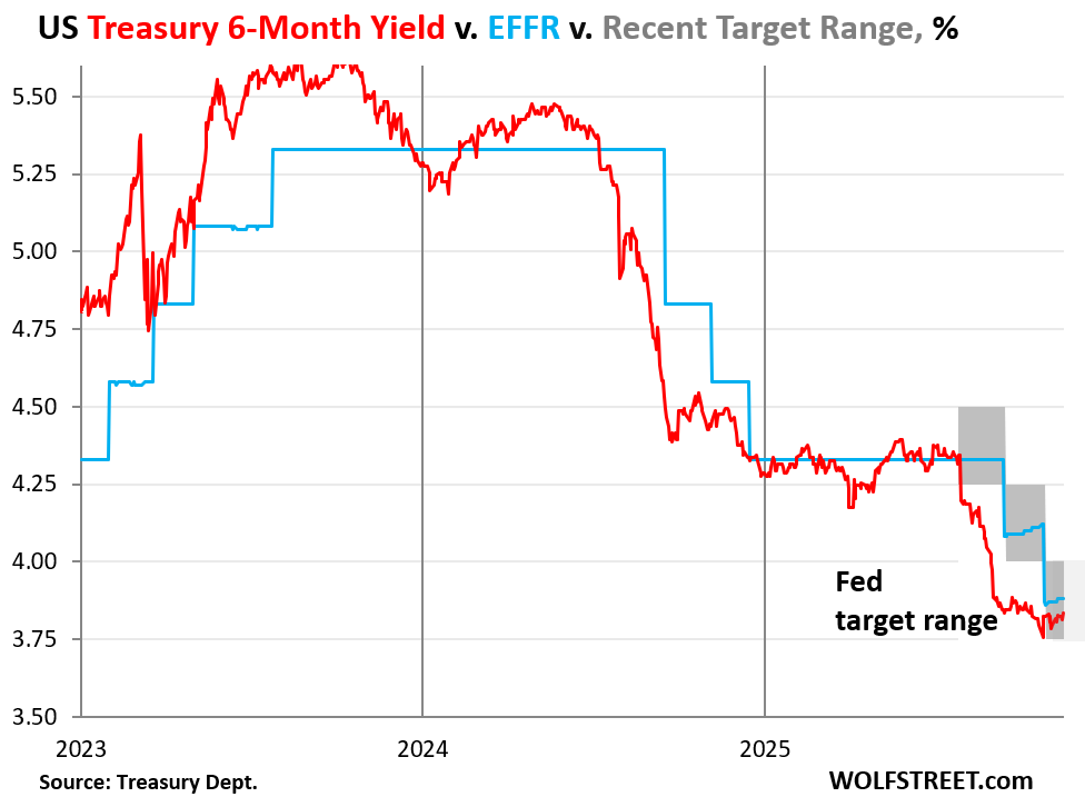 Traders and algos scrutinize everything that the Fed publishes, such as these minutes, and everything Fed speakers say in their speeches, and they trade accordingly. As a result, the 6-month Treasury yield reacts to expectations of the Fed’s policy rates over the next two or so months and is a good indicator where the Treasury market thinks the Fed’s policy rates will be within its two-month-plus window. And now, with the yield in the Fed’s target range, it predicts no change in December, and little chance of a rate cut at the January 27-28 meeting