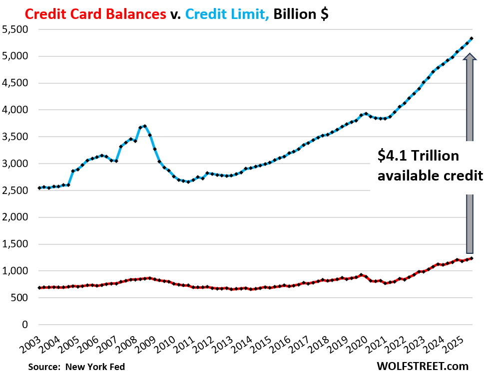 And thereby the total available unused credit rose to a record $4.1 trillion (gray arrow).