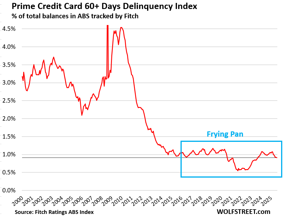 For prime-rated cardholders, the serious delinquency rate of 60-plus days dropped to 0.91%, the lowest on record outside of the Free-Money era, according to data from Fitch Ratings, which tracks the performance of Asset Backed Securities (ABS) backed by credit card balances whose holders had a prime credit rating when the accounts were opened.