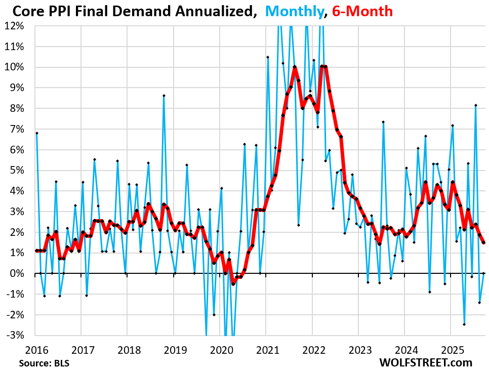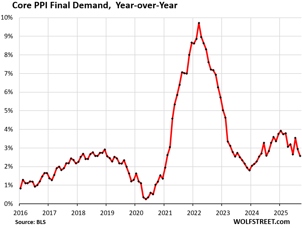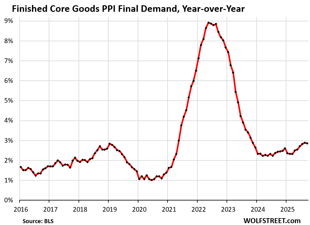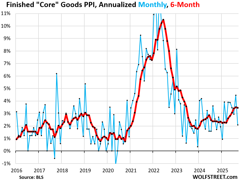 The PPI for “Finished Core Goods” rose by 0.17% (+2.1% annualized) month-to-month in September, after the jump in August that was revised up to +4.5% annualized (from the originally reported +3.8%).