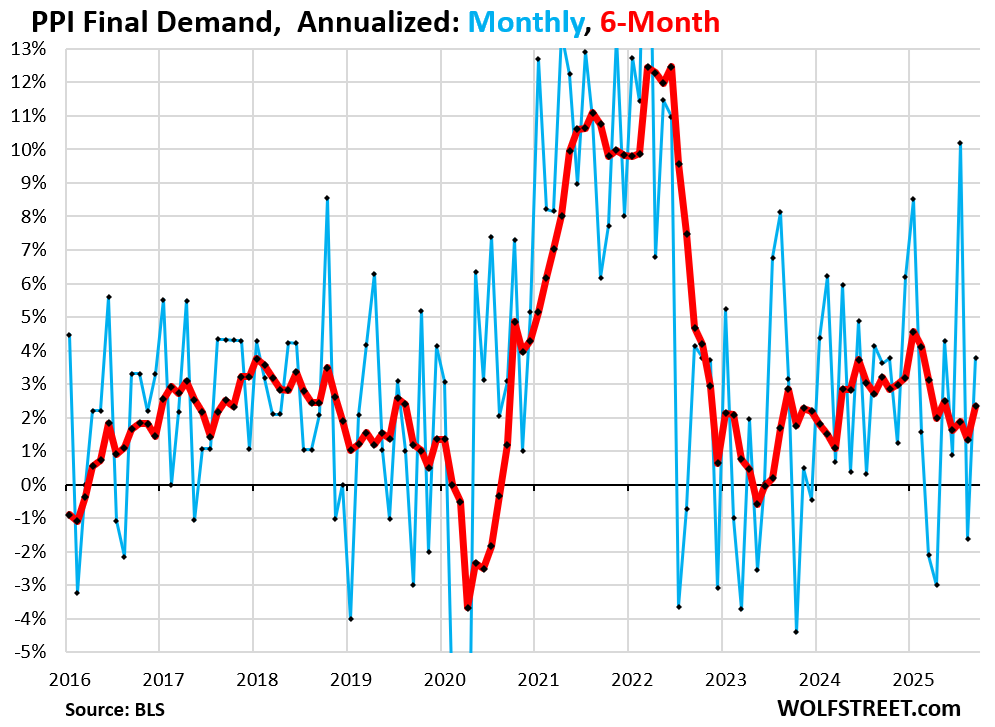 The Producer Price Index Final Demand bounced back in September, rising by 0.31% month-to-month (+3.8% annualized), after the drop in August (-1.6% annualized), seasonally adjusted, according to the delayed release by the BLS today (blue line in the chart).