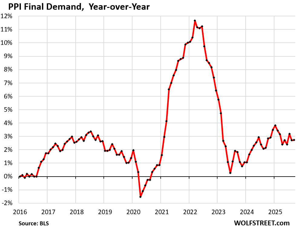 The tariffs paid by companies show up here indirectly. The PPI does not track import prices. It tracks prices that companies charge each other and thereby does not directly track the costs of tariffs that companies are paying on imported goods.