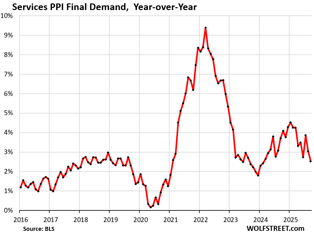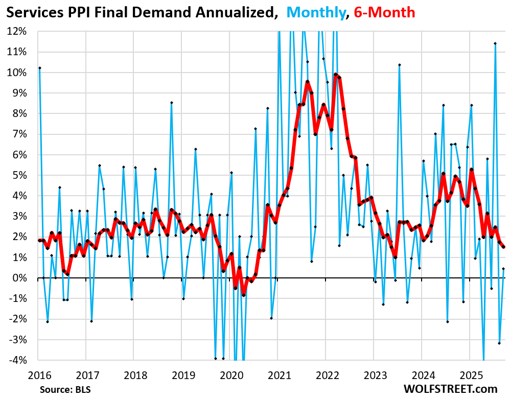 The PPI Final Demand Services edged up +0.04% (+0.4% annualized) in September, after the negative reading in August, which had followed the majestic spike in July.