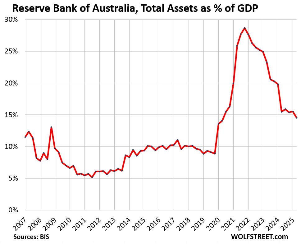 The Reserve Bank of Australia ended QE in 2021 when its assets-to-GDP ratio peaked at 28.6%. The ratio has now dropped to 14.6%: