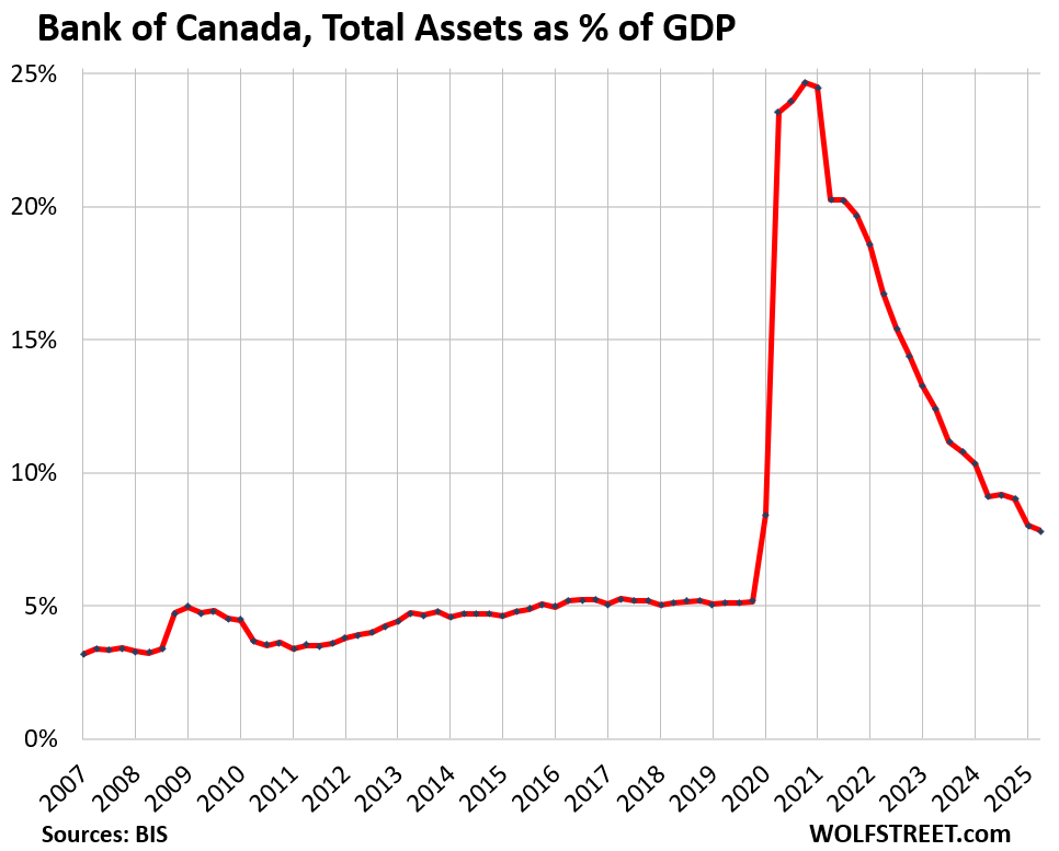 The Bank of Canada maxed out its assets-to-GDP ratio in Q4 2020 at 24.7%, after short but massive QE. It ended QE at relatively low levels and then shed assets fast and furious (details here).