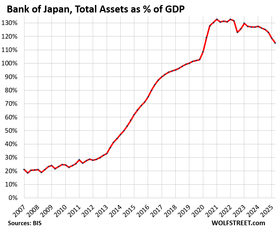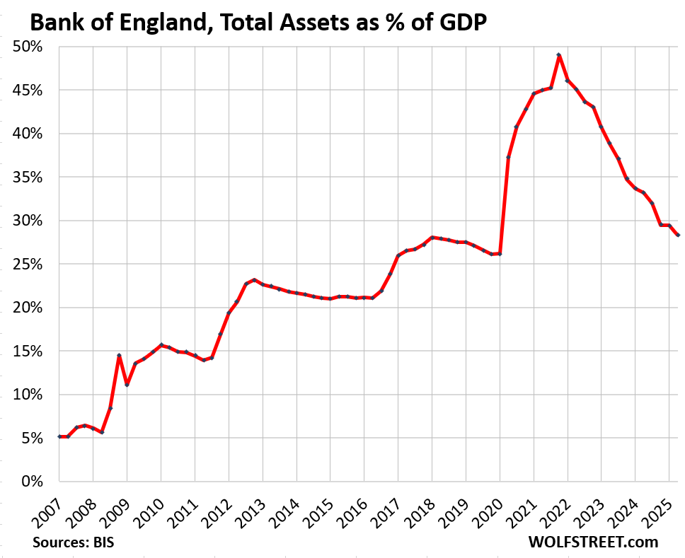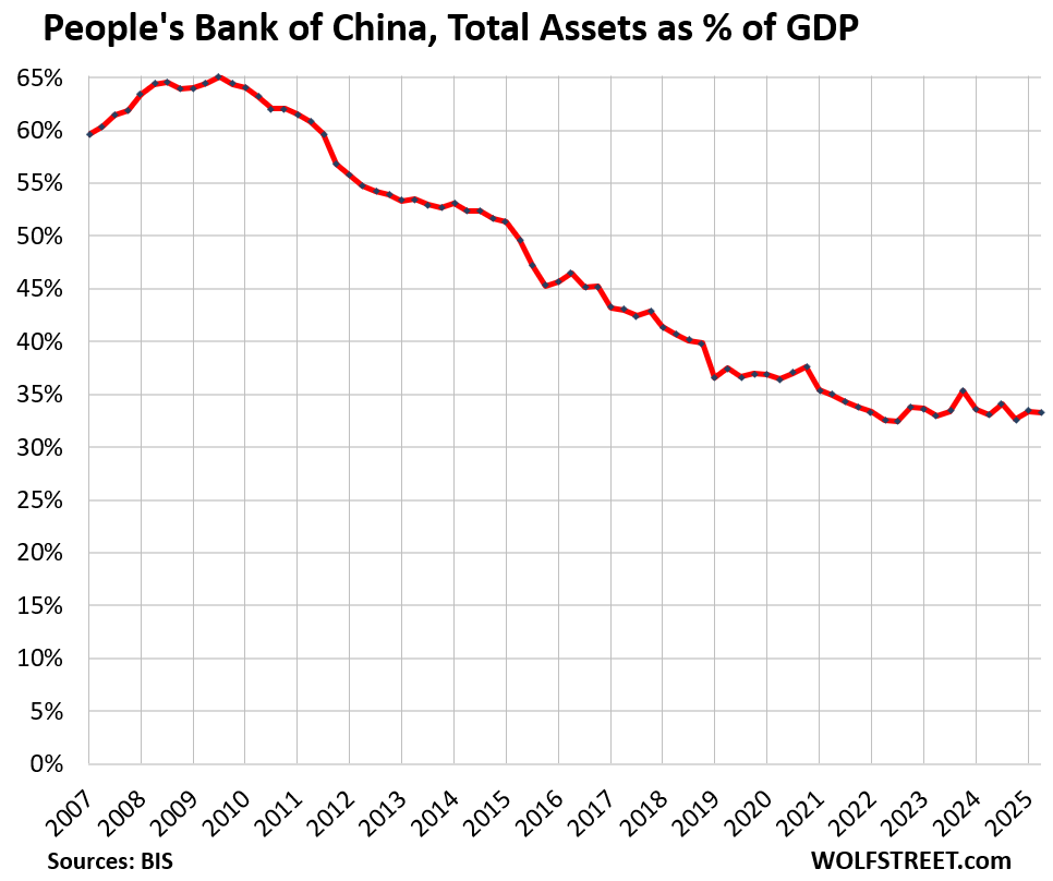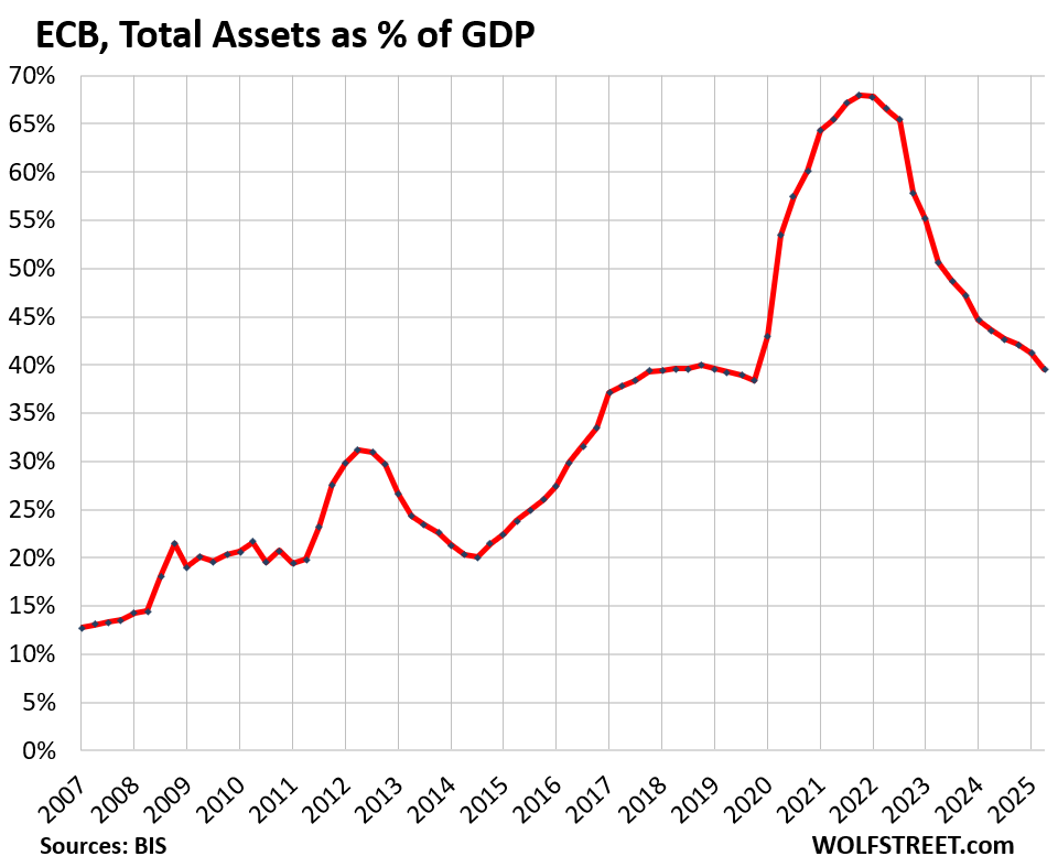 The ECB’s total-asset-to-GDP ratio has dropped to 39.5%, according to BIS data today. While this removed the entire pandemic QE spike, and is way down from the crazed money-printing peak in Q4 2021 when the ratio had hit 68%, it remains very high. (By comparison, the Fed’s assets-to-GDP ratio had maxed out at just under 36% in early 2022 and is now at 21.6%.)