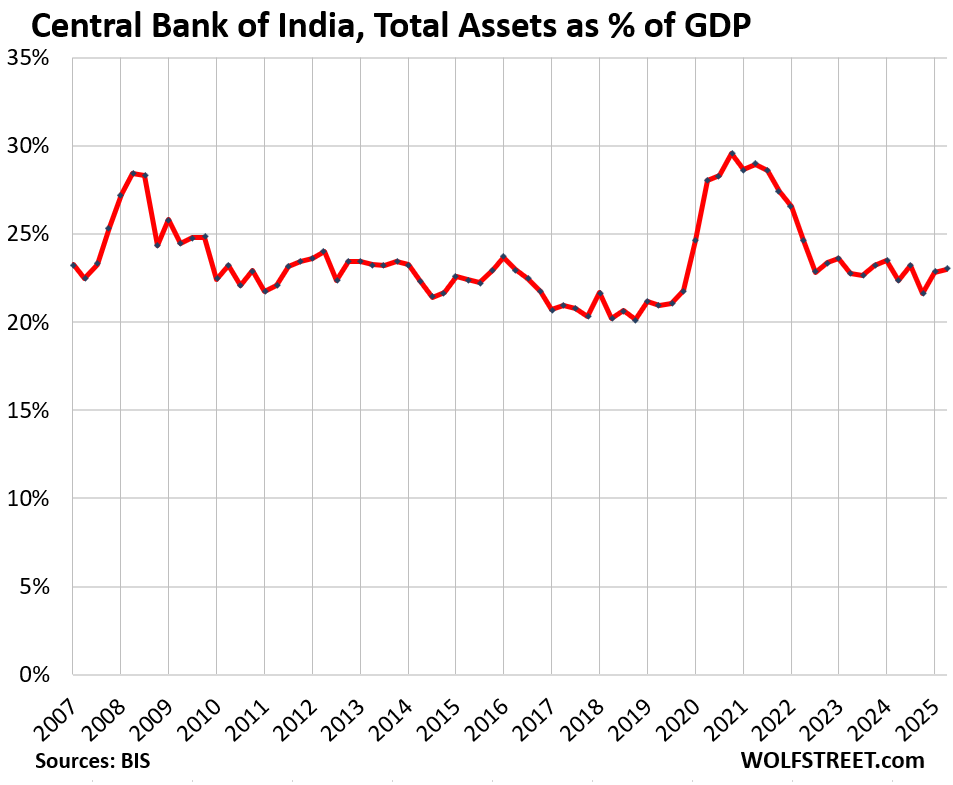 The Central Bank of India, which has to keep an eye on its continuously devaluing currency (against the USD), used QE briefly during the last two crises, but reverted quickly to its relatively high normal assets-to-GDP ratio, which was 23% in the last quarter.