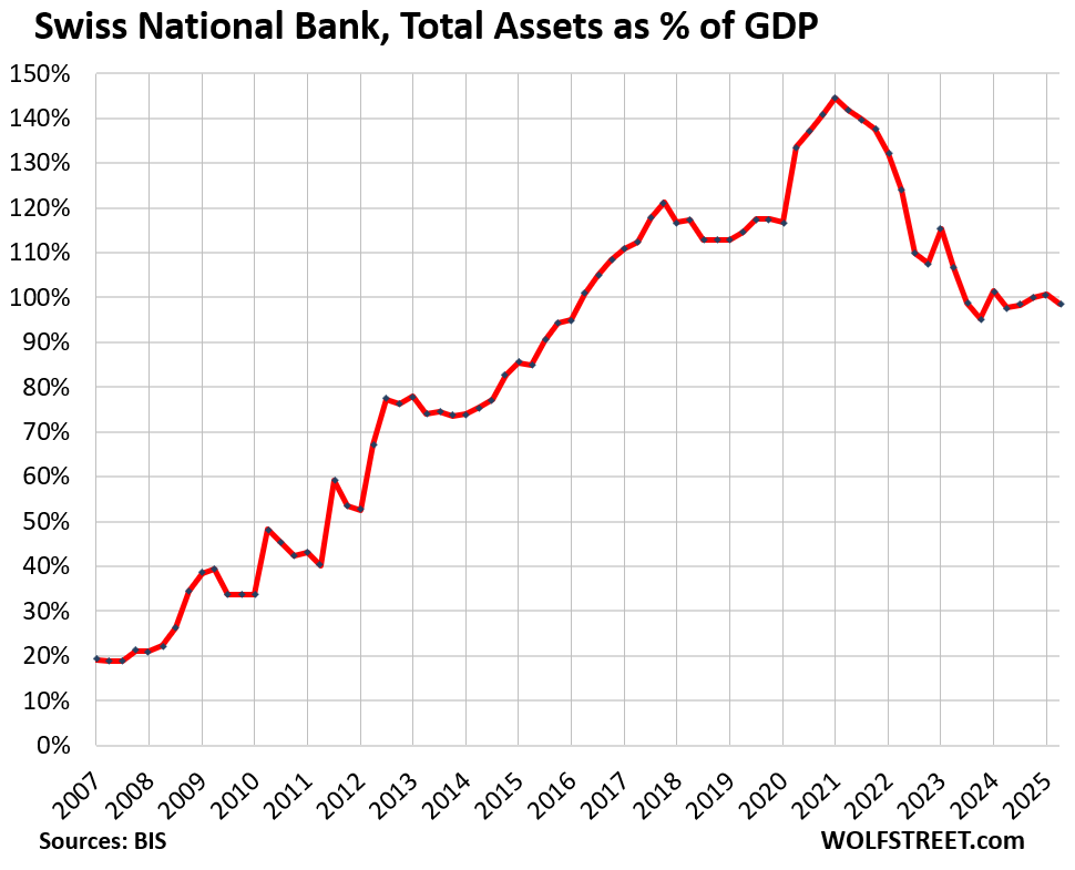 The Swiss National Bank is onto a different scheme rather than QE. It prints Swiss francs (CHF), but instead of buying CHF-denominated assets, as you’d do for QE, it sells the francs in the foreign exchange markets into ravenous demand, and with the dollars, euros, etc., that it obtains this way, buys assets denominated in those currencies. Under US law, it has to disclose in quarterly SEC filings its holdings of US stocks, so we can follow those. But the details of its other holdings are not disclosed. So this is not really a QE-inflated balance sheet; this is the balance sheet of a hedge fund that can print its own money. It only works as long as there is ravenous demand for Swiss francs.