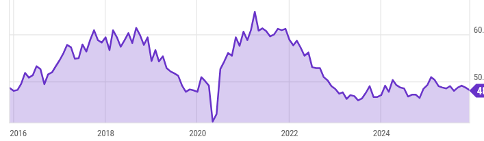 Here is the 10-year chart from the ISM report, screenshot from YCharts.